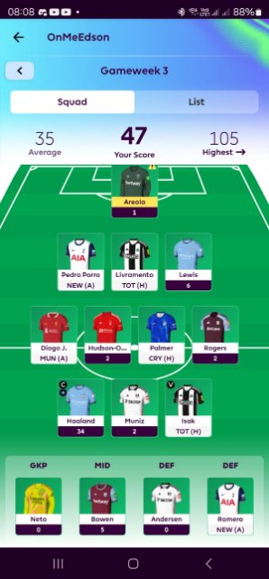 I'm in that Westhamonline league's well. I'm challenging for a Champions League spot, so perhaps not too bad. Can't say I have many tips though. I see you have Haaland, I didn't do that thought it was too much, he has to get the points of 2-3 players, but then he is doing that. I went for Salah. Thinking about doing my wild card now during the break, but not sure I'll get it done.