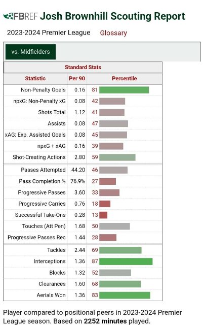 Here's Ward Prowse's comparative stats in the same season as Brownhill (23/24)...all be it under Moyes: