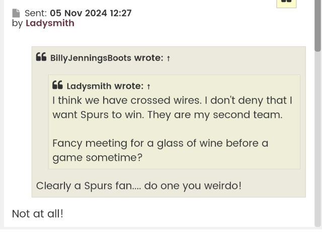 BillyJenningsBoots wrote: ↑19 Nov 2024, 21:52Ladysmith wrote: ↑19 Nov 2024, 13:16BillyJenningsBoots wrote: ↑19 Nov 2024, 10:42More bollocks from the Spurs fan!!!!! FFS can't we ban this idiot!!!!Really?Yep... further compounded by this absolute fuckwitery on the Next Manager thread..."i think we are going to get relegated and if I’m honest, it may do the club the world of good as it will give us a period of cleansing."